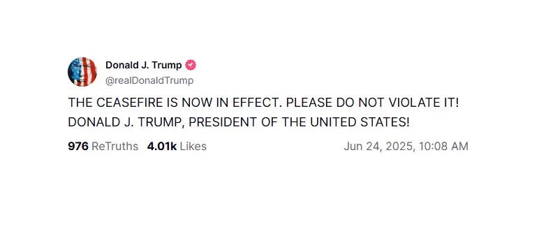 صدر ڈونلڈ ٹرمپ نے ٹروتھ سوشل پر لکھا ہے جنگ بندی اب نافذ العمل ہے۔ پلیز اس کی خلاف ورزی نہ کریں۔یاد رہے کہ اسرائیل نے تاحال اس جنگ بندی کو سرکاری طور پر قبول نہیں کیا جبکہ ایران کے سرکاری ٹیلی ویژن نے چند گھنٹے قبل اعلان کیا تھا کہ اسرائیل پر جنگ بندی نافذ ہو چکی ہے۔ٹروتھ سوشل پر اپنی پوسٹ میں امریکی صدر نے لکھا ہے کہ سیزفائر کا نفاذ ہو چکا ہے۔