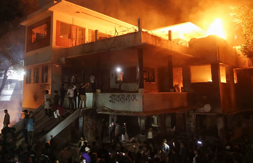 بنگلہ دیشی عوام نے شیخ مجیب کی یادگار اور رہائش گاہ کو نذر آتش کردیا .شیخ حسینہ کی آن لائن تقریر کے بعد عوامی لیگ کے خلاف احتجاج شروع ہوا جس میں بنگلہ دیشی عوام نے شیخ مجیب الرحمان کی یادگار اور رہائش گاہ پر دھاوا بول دیا۔ عوامی ہجوم کی جانب سے عوامی لیگ پر پابندی کا بھی مطالبہ کیا گیا۔ دھان منڈی 32 میں واقع عوامی ہجوم نے شیخ مجیب الرحمان کی یادگار اور رہائش گاہ میں توڑ پھوڑ کی مقامی میڈیا کے مطابق سابق وزیر اعظم شیخ حسینہ کی آن لائن تقریر کے بعد عوامی لیگ کے خلاف احتجاج شروع ہوا سوشل میڈیا پر مطالبہ کیا گیا تھا کہ اگر شیخ حسینہ آن لائن تقریر کرتی ہیں توشیخ مجیب الرحمان کی دھان منڈی 32 میں واقع رہائش گاہ کی طرف بلڈوزر جلوس جایا جائےرات 8 بجے کے قریب مظاہرین ایک ریلی کی شکل میں شیخ مجیب کی رہائش گاہ پہنچے۔ عوام مین گیٹ کو توڑتے ہوئے زبردستی اندر گھس گئی۔مظاہرین کا کہنا تھا کہ شیخ مجیب الرحمان کا خاندان آمریت اور فسطائیت کی علامت ہے بنگلہ دیش سے مجیب ازم کے فاشزم کے ہر نشان کو مٹا دیا جائے گا۔مظاہرین کی جانب سے شیخ حسینہ واجد کو واپس لا کر پھانسی دینے کا مطالبہ بھی کیا گیا بنگلہ دیش میں انقلاب اور حکومتی تبدیلی کے بعد سے شیخ حسینہ واجد کی عوامی لیگ تاحال زیرعتاب ہے