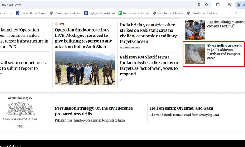 بھارتی حکومت کے دباؤ پر بھارتی میڈیا نے اپنی ویب سائٹس سے ہٹانا شروع کردی مودی سرکار نے بھارتی میڈیا کو اپنے مکمل کنٹرول میں جکڑ رکھا ہے۔بھارت کا معروف انگریزی اخبار دی ہندو بھی اس دباؤ کا شکار ہوگیا.دی ہندو نے بھارتی طیارے تباہ ہونے کی خبر ویب سائٹ سے ہٹادی جبکہ ایکس پر پوسٹ کی گئی خبر بھی ڈیلیٹ کردی۔بھارت کے انگریزی روزنامے دی ہندو نے اپنی ویب سائٹ پر مقبوضہ کشمیر میں پاک فضائیہ کی کارروائی میں 3 بھارتی طیارے تباہ ہونے کی خبر شائع کی تھی اور تباہ ہونے والے طیاروں کی تصاویر بھی شیئر کی تھی کچھ دیر بعد خبر ویب سائٹ سے ہٹالی گئی ویب سائٹ پر ابتدا میں خبر دکھائی دے رہی ہے تاہم کلک کرنے کے بعد تفصیلات سامنے نہیں آرہی تھی اور بعد میں خبر مکمل غائب ہوگئی .اسی طرح حکومت کے سخت کنٹرول کے باعث طیاروں کی خبریں اور تصاویر ھٹانا شروع کردی گئی ہیں