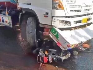 پورٹ قاسم ٹویوٹا چورنگی کے قریب ٹریلر کی ٹکر سے موٹر سائیکل سوار نوجوان جاں بحق ہوگیا.متوفی کی شناخت 23 سالہ محرم ولد صالح محمد کے نام سے کی گئی جو کہ موٹر سائیکل پر سوار تھا جبکہ حادثہ این ایل سی ٹریلر کی ٹکر سے پیش آیا تھا۔تاہم پولیس نے موقع پر پہنچ کر ڈرائیور کو گرفتار کر کے ٹریلر اپنے قبضے میں لے لیا۔متوفی کے قبضے سے مقامی کمپنی کا کارڈ ملا ہے جس پر اس کا عہدہ ہیلپر لکھا ہے.