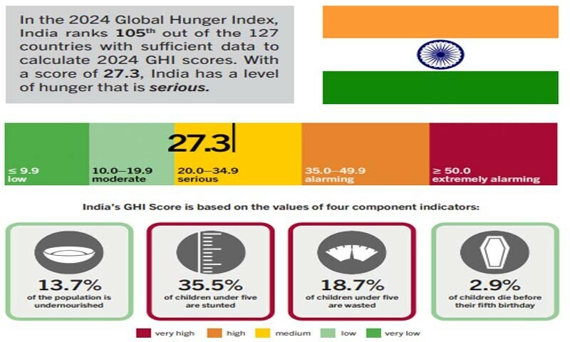 ورلڈ ہنگر انڈیکس کی رینکنگ میں بھوک کے حوالے بھارت 127 ملکوں میں سے 105 ویں نمبر پر آگیا۔مڈل اور لوئر مڈل کلاس عوام کے پاس محض 3 فیصد دولت ہے، تقریباً 70 کروڑ بھارتی شہریوں کو غذائی قلت کا سامنا ہے۔بھارت کی مجموعی دولت کا 40 فیصد صرف ایک فیصد امیر طبقے کے پاس ہے۔ورلڈ ہنگر انڈیکس کی سال 2024 کے حوالے سے جاری کردہ رپورٹ کے مطابق بھارت کے ایک فیصد امیر طبقے کو نکال دیا جائے تو عوام کی حالت افریقہ کے پسماندہ ترین ممالک سے بھی بدتر ہے۔ورلڈ ہنگر انڈیکس کی رپورٹ کے مطابق بھارت کی 90 فیصد لیبر فورس مقرر کردہ سے کم اجرت لیتی ہے۔جبکہ 27 فیصد سے زائد عوام غربت کی لکیر سے نیچے زندگی گزارنے پر مجبور ہیں۔