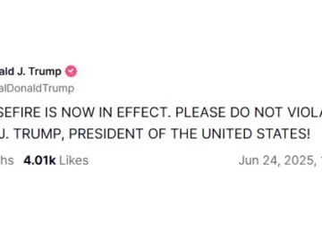 صدر ڈونلڈ ٹرمپ نے ٹروتھ سوشل پر لکھا ہے جنگ بندی اب نافذ العمل ہے۔ پلیز اس کی خلاف ورزی نہ کریں۔یاد رہے کہ اسرائیل نے تاحال اس جنگ بندی کو سرکاری طور پر قبول نہیں کیا جبکہ ایران کے Read More